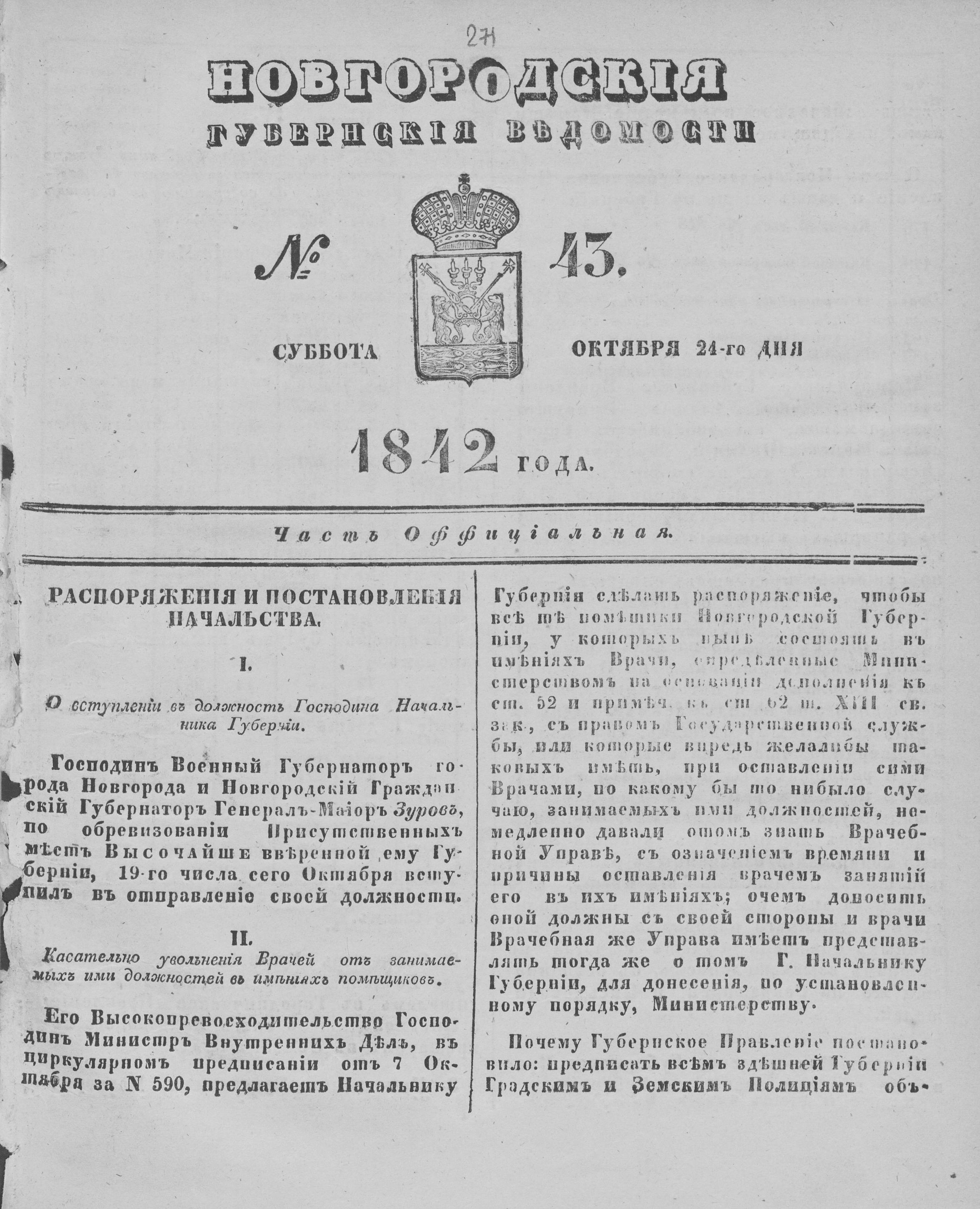 СУББОТА 24 ОКТЯБРЯ 1842 ГОДА