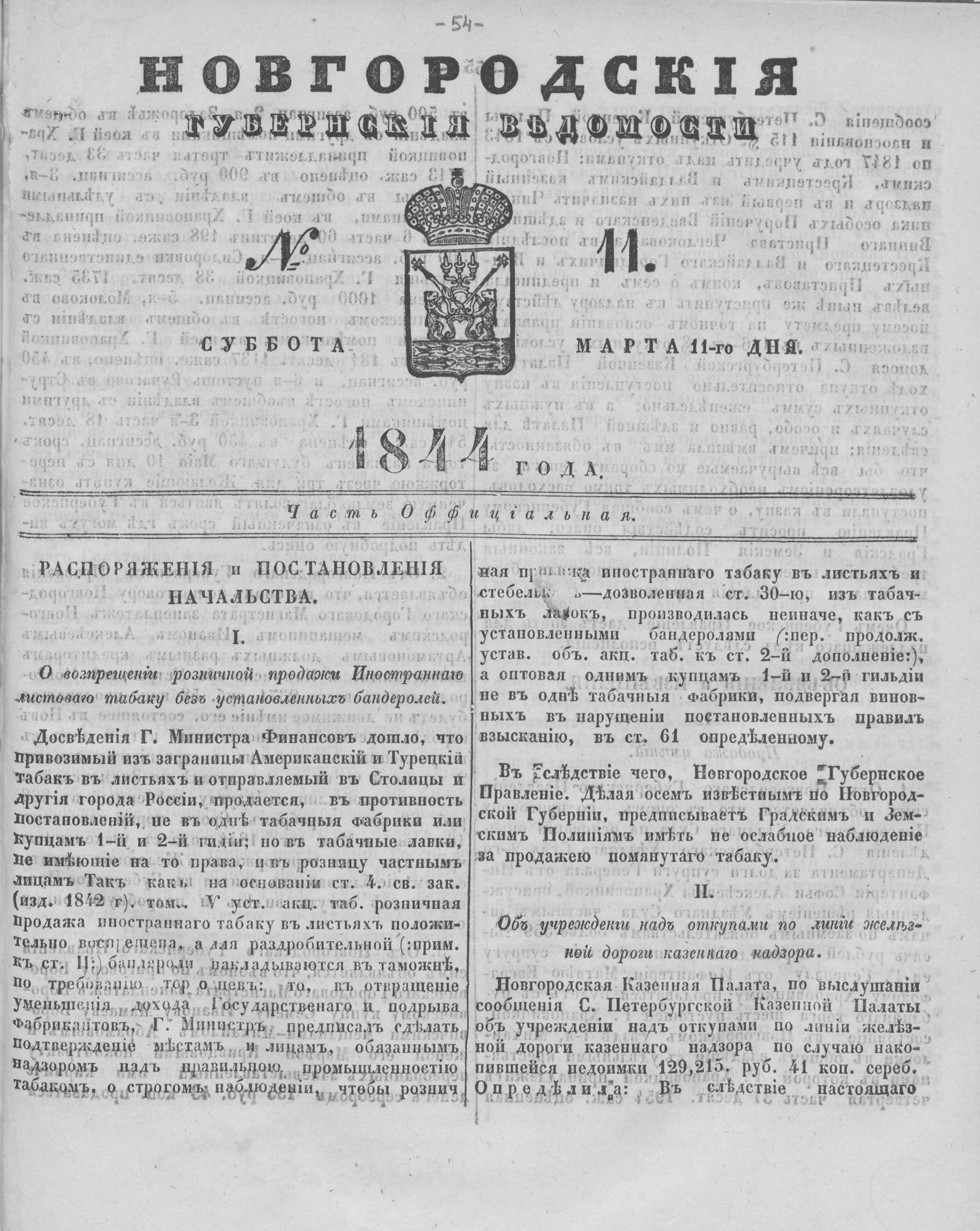 НОВГОРОДСКИЕ ГУБЕРНСКИЕ ВЕДОМОСТИ№11СУББОТА 11 МАРТА 1844 ГОДАЧасть официальная О воспрещении розничной продажи ... Об учреждении над откупами ...