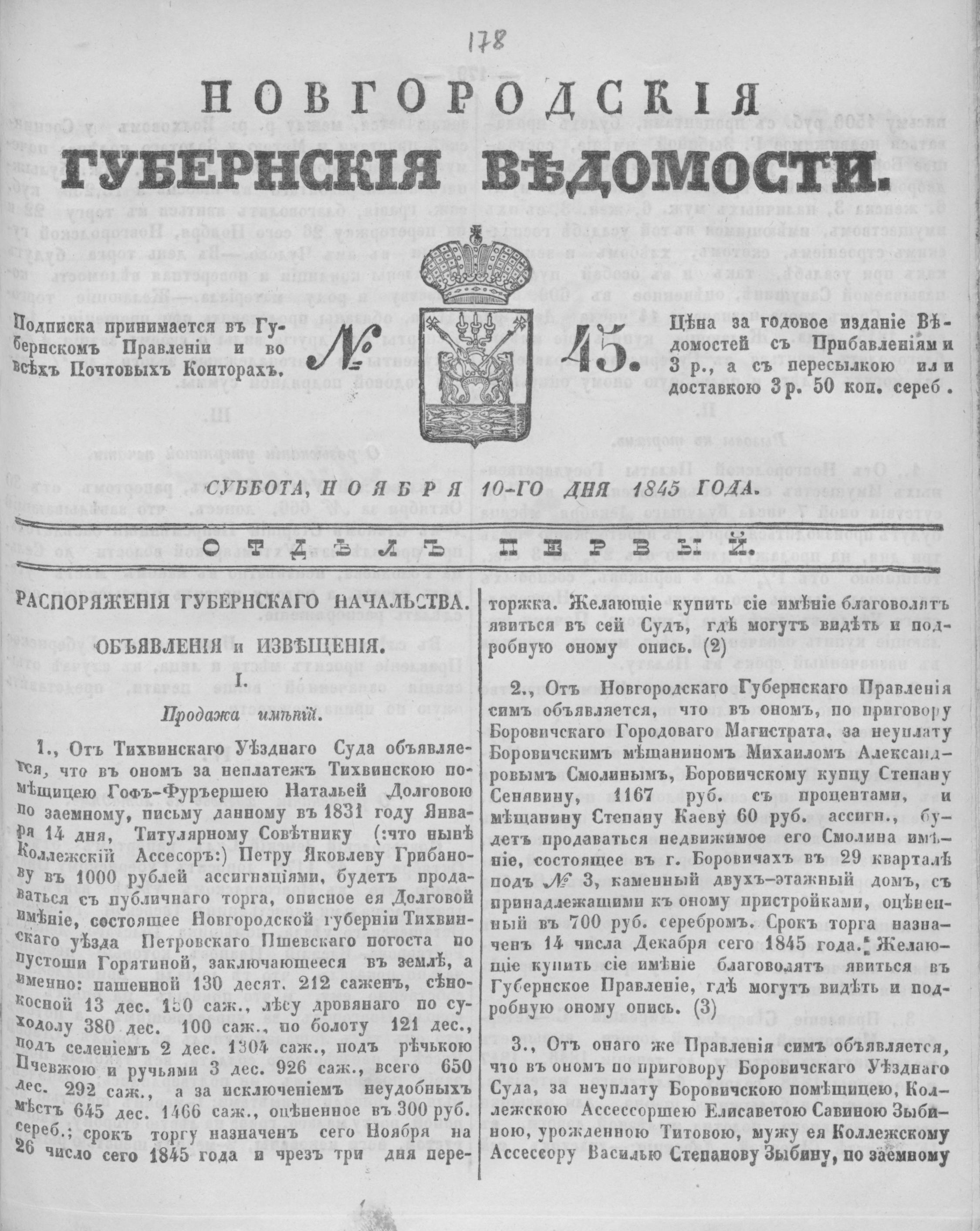 НОВГОРОДСКИЕ ГУБЕРНСКИЕ ВЕДОМОСТИ№45СУББОТА 10 НОЯБРЯ 1845 ГОДАОТДЕЛ ПЕРВЫЙРАСПОРЯЖЕНИЯ ГУБЕРНСКОГО НАЧАЛЬСТВА Продажа имений