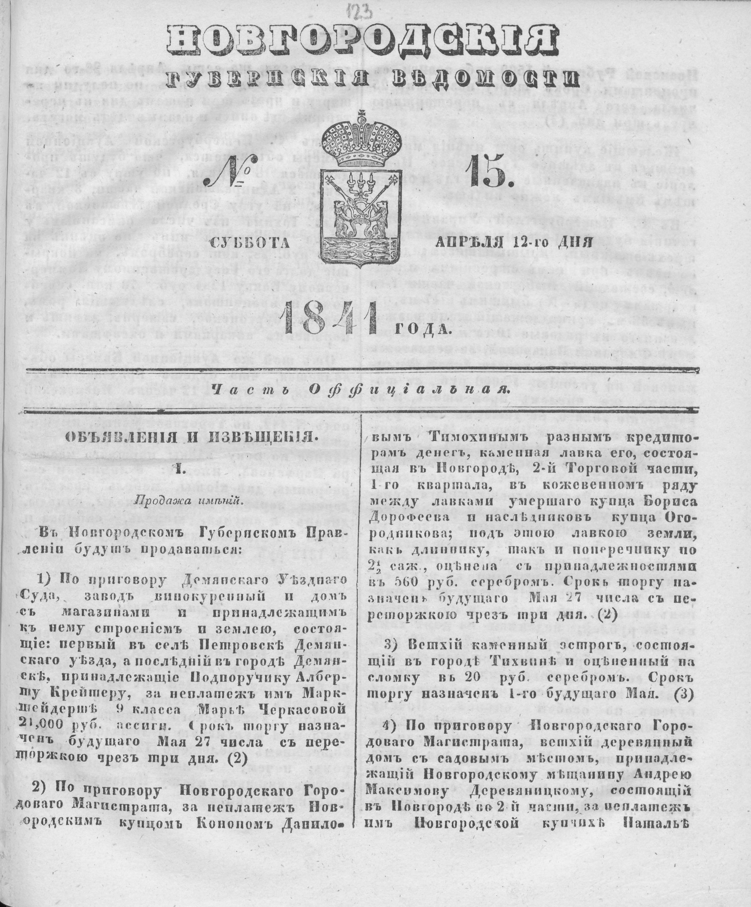 НОВГОРОДСКИЕ ГУБЕРНСКИЕ ВЕДОМОСТИ№15. Суббота, 12 апреля,1841 год Стр. 1Часть официальная Объявления и извещения: Продажа имений.