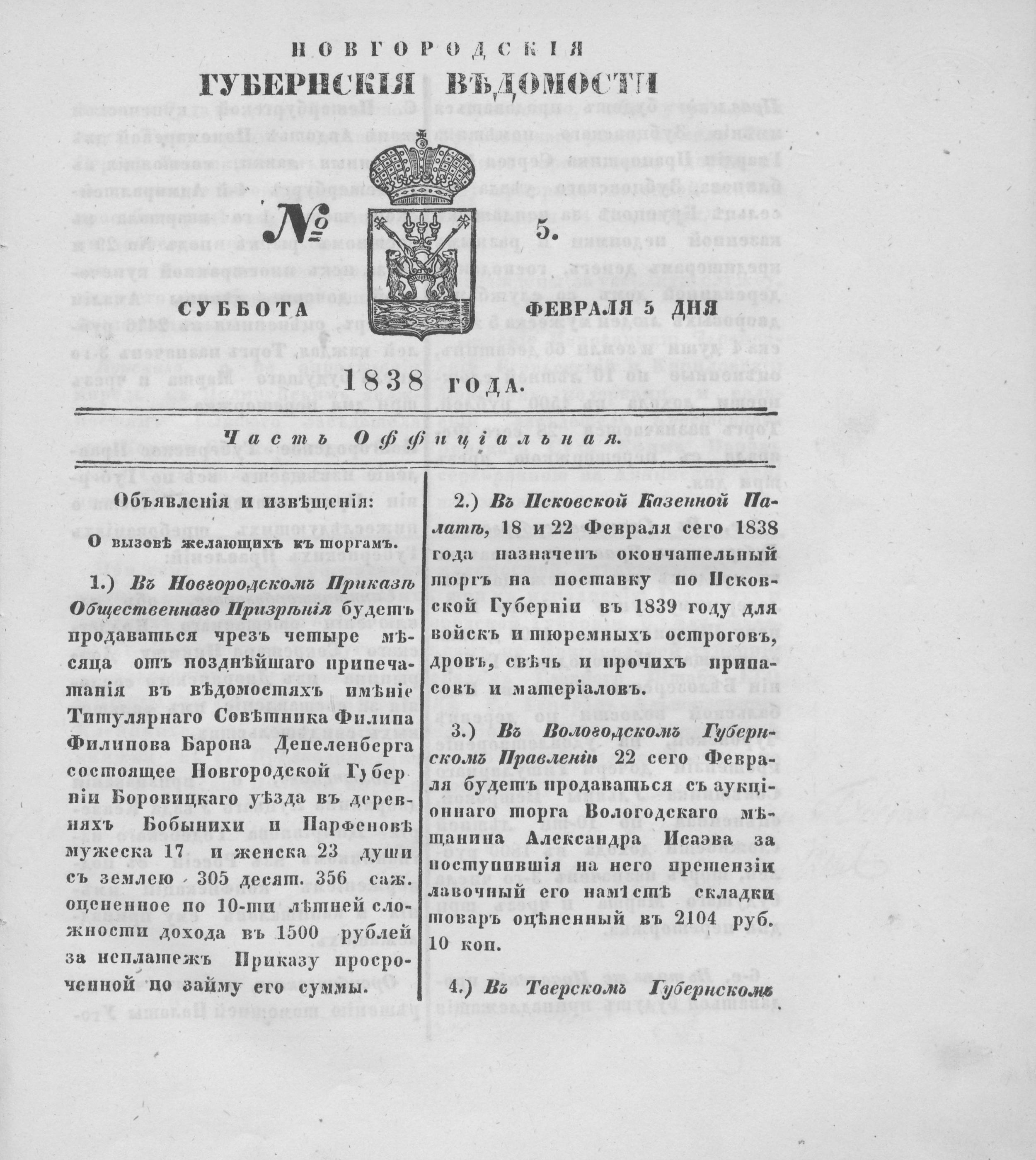 №5. Суббота, 5 февраля,1838 год
