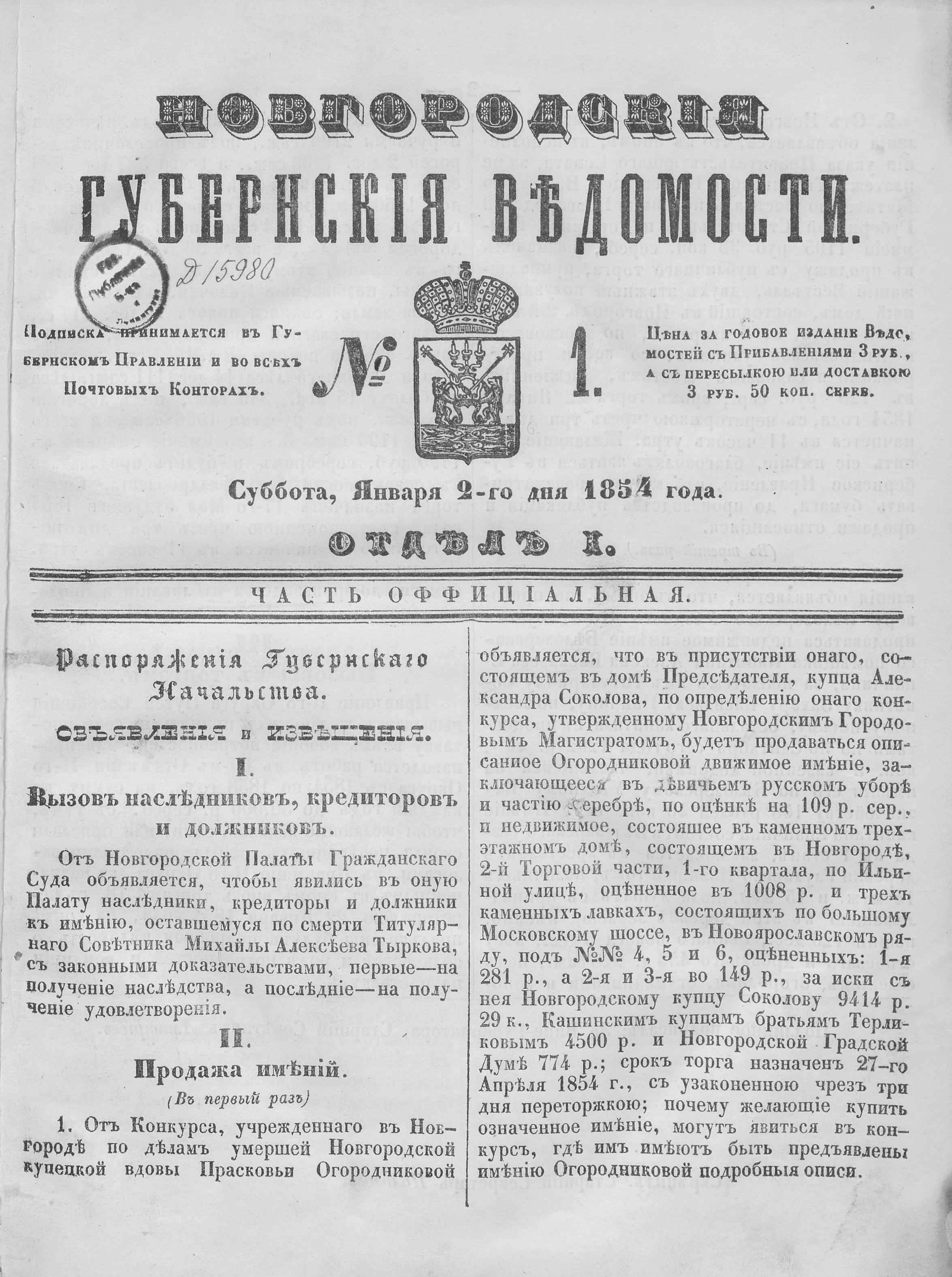 №1, 2 января 1854 год