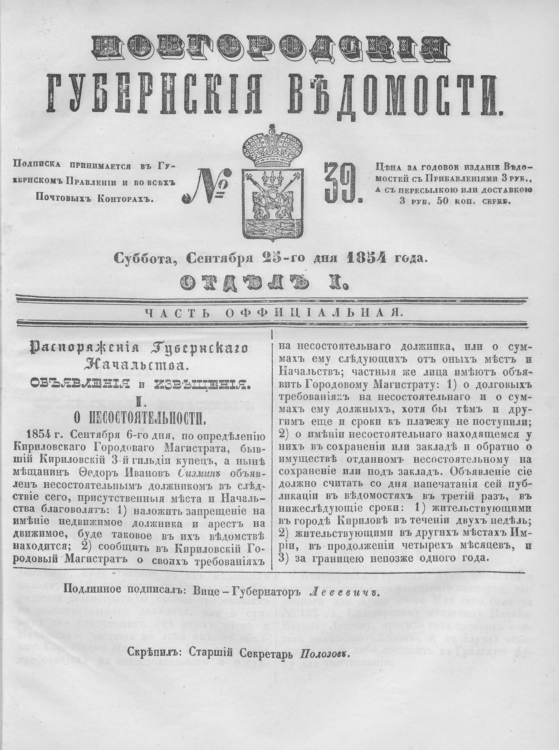№39, 25 сентября 1854 год