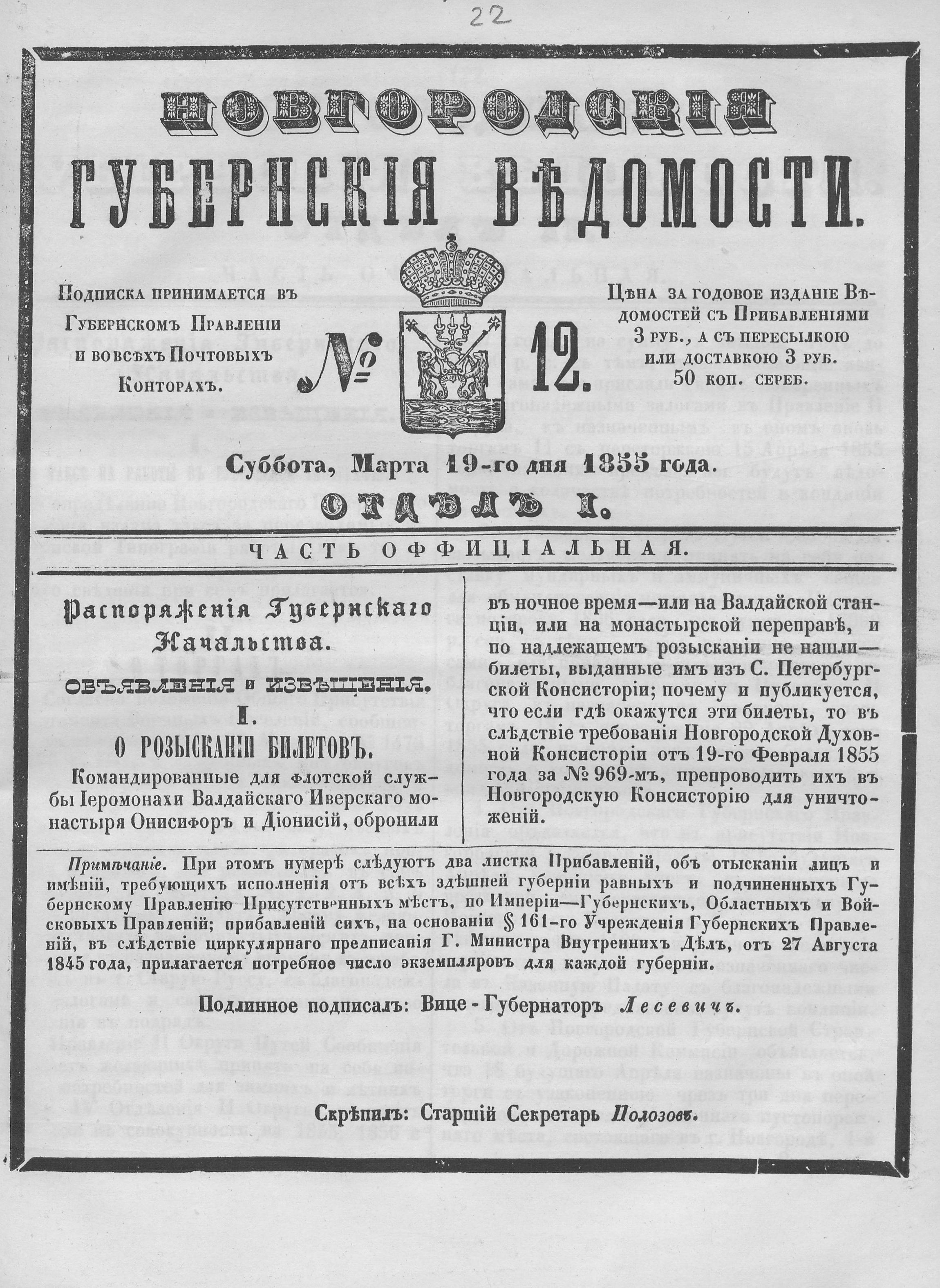 №12, 19 марта 1855 год