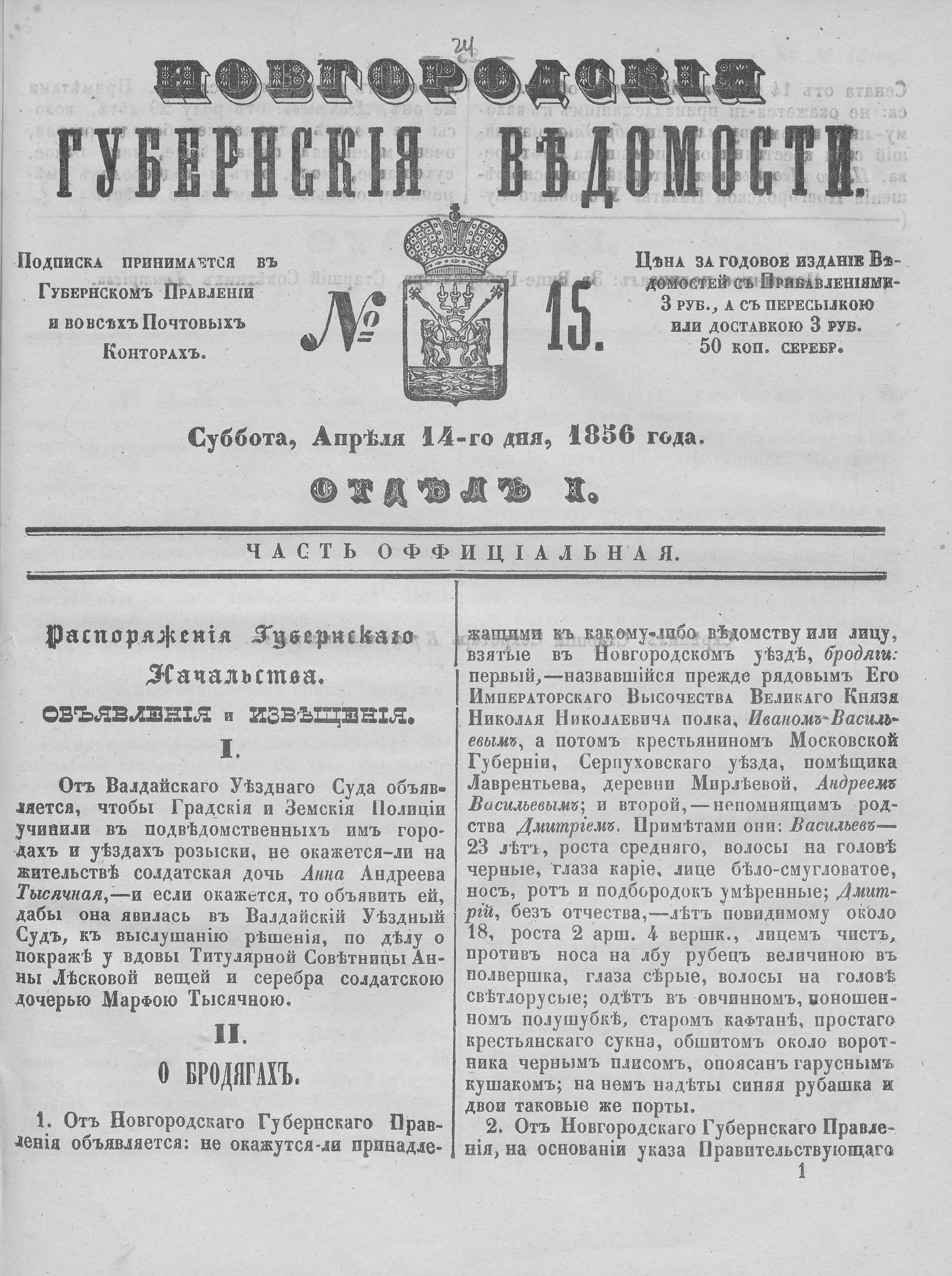 От Валдайского Уездного Суда объявляется…; О бродягах (стр. 1-2)