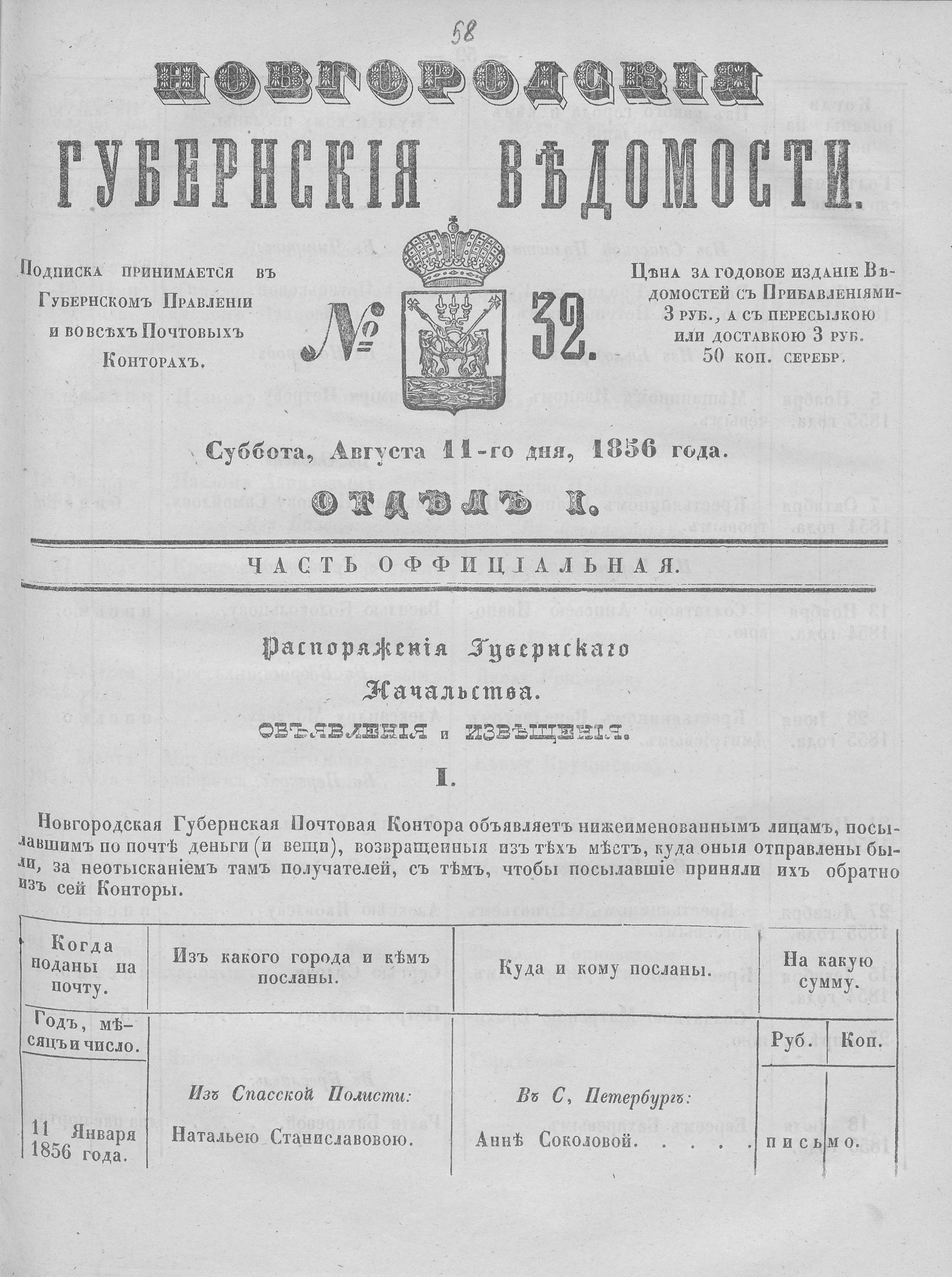 Новгородская Губернская Почтовая Контора объявляет… (стр. 1-10)
