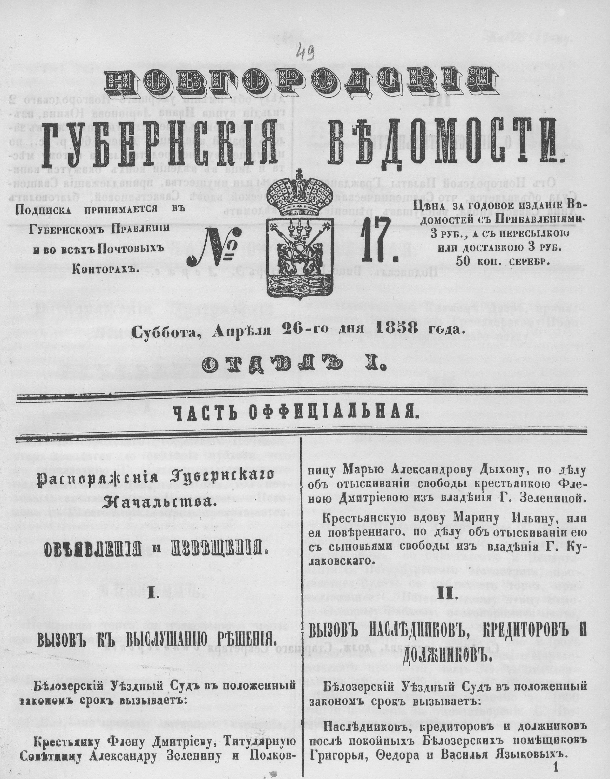 №17, 26 апреля 1858 год