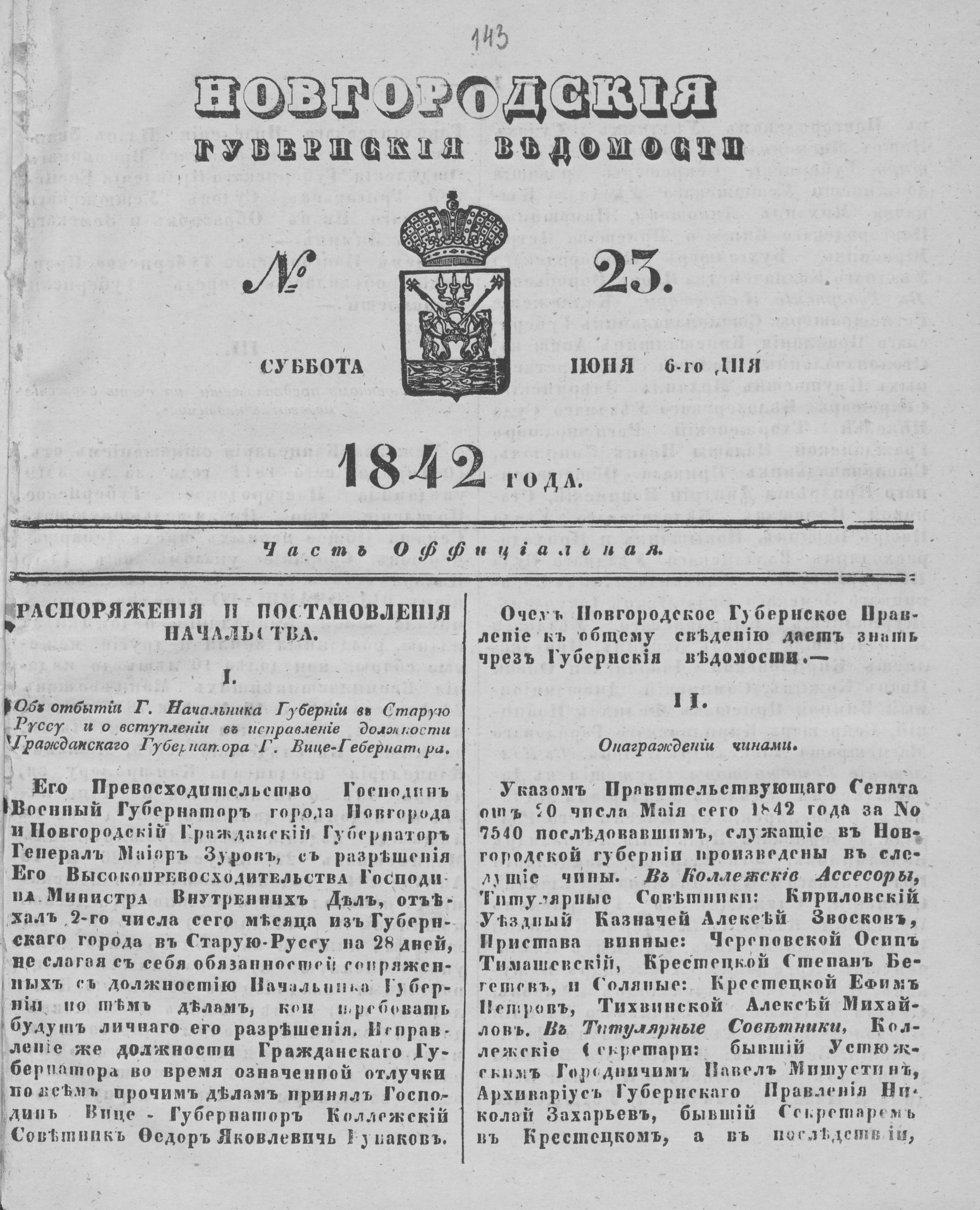 НОВГОРОДСКИЕ ГУБЕРНСКИЕ ВЕДОМОСТИ№23СУББОТА 6 ИЮНЯ 1842 ГОДА Об отбытии Г. Начальника Губернии... О награждении чинами