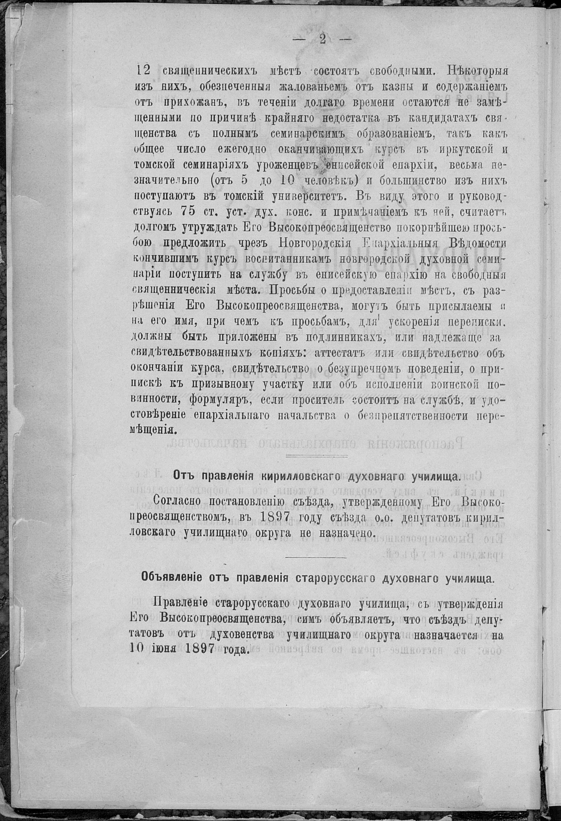 Объявление от правления Старорусского духовного училища (о съезде депутатов 10 июня 1897 г.)